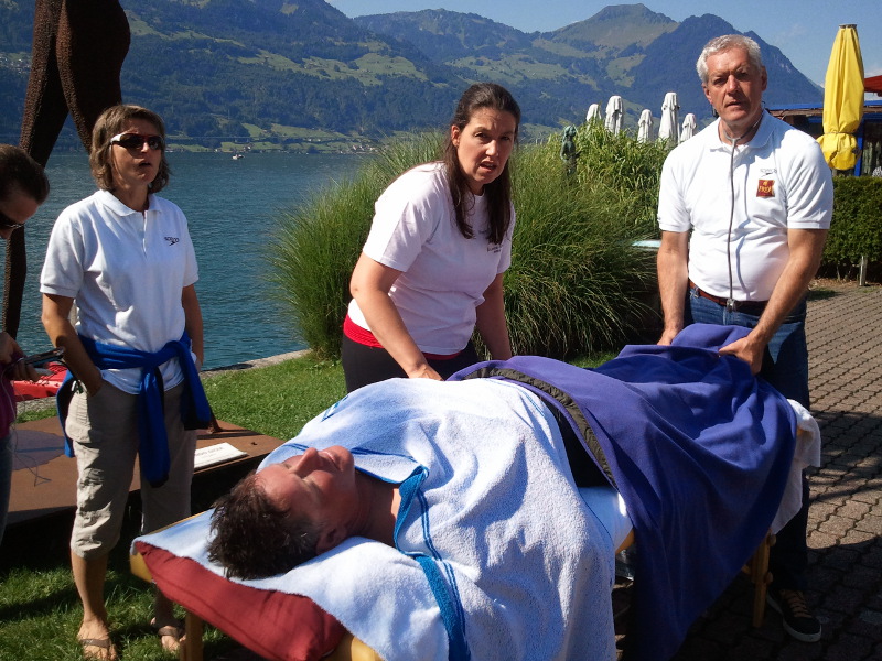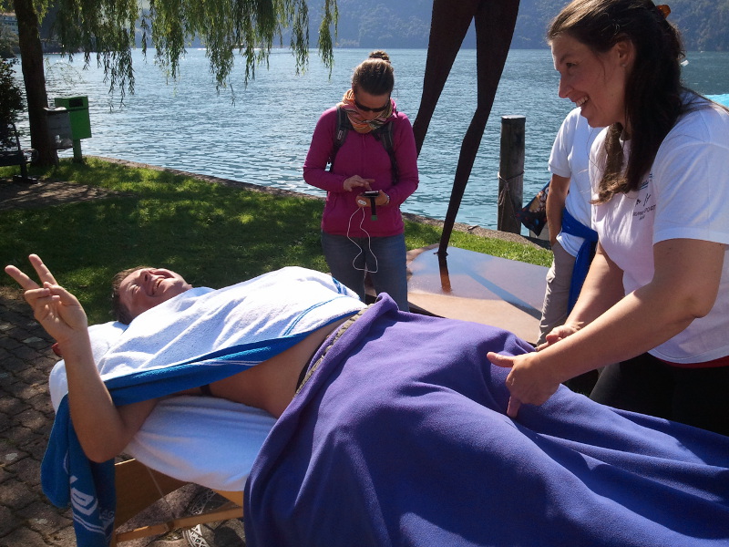 Nach 6 Stunden 20 Minuten ist Jürg in Gersau angelangt, wo nach einem kurzen Interview der Medical Stop (Blutdruck, Physio etc.) erfolgt. Jürg scheint es sichtlich zu geniesen.